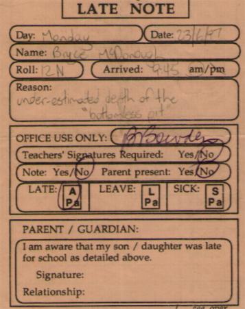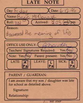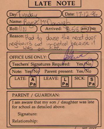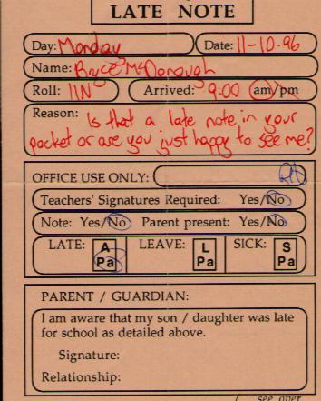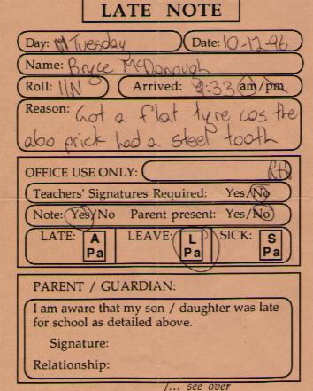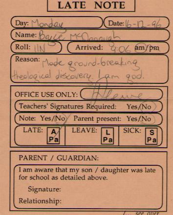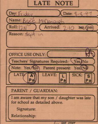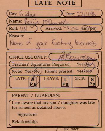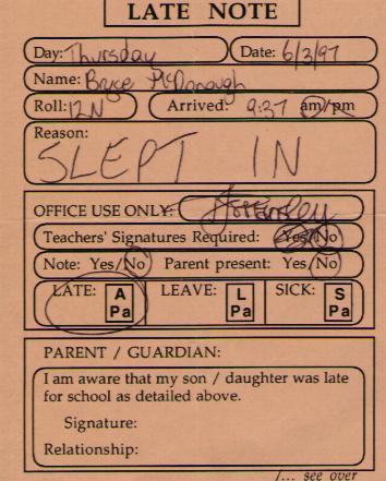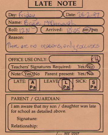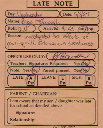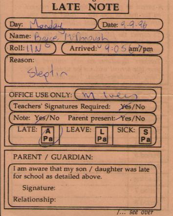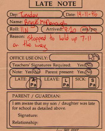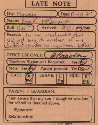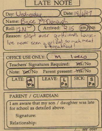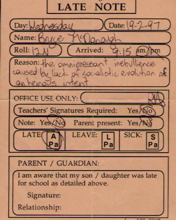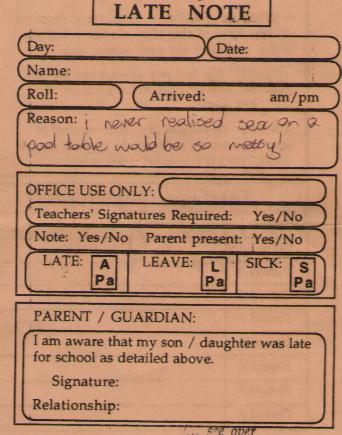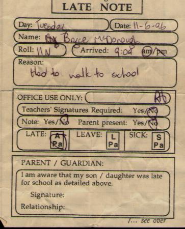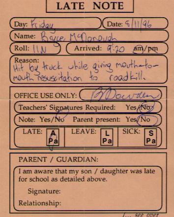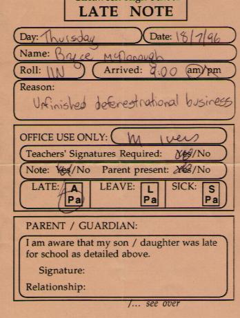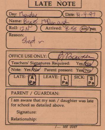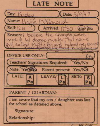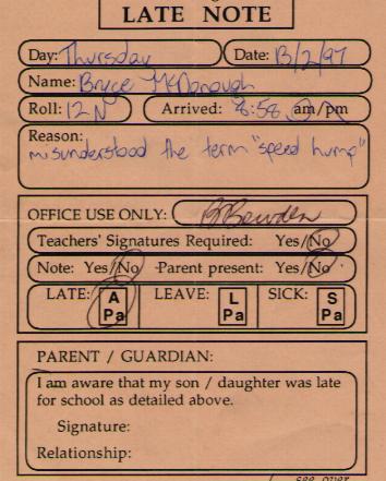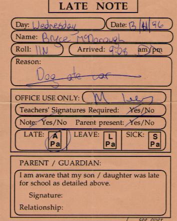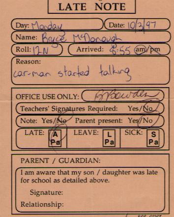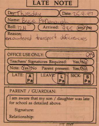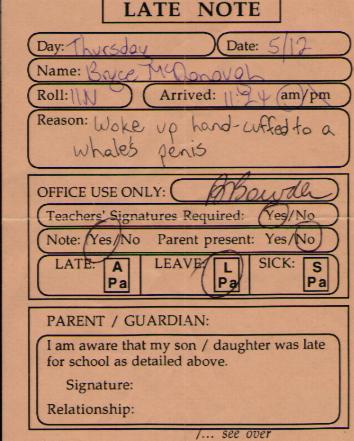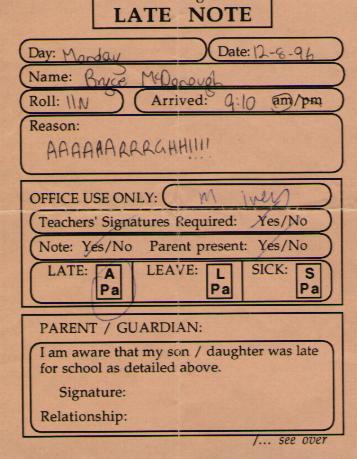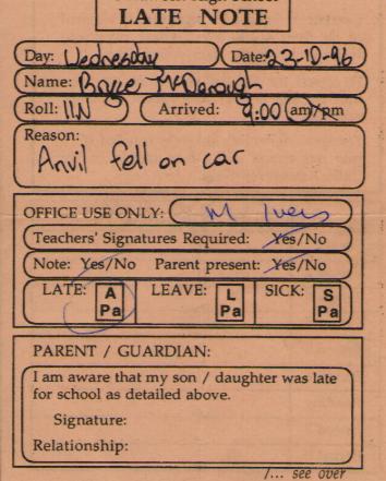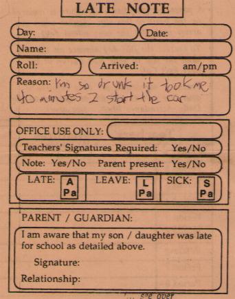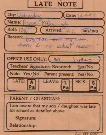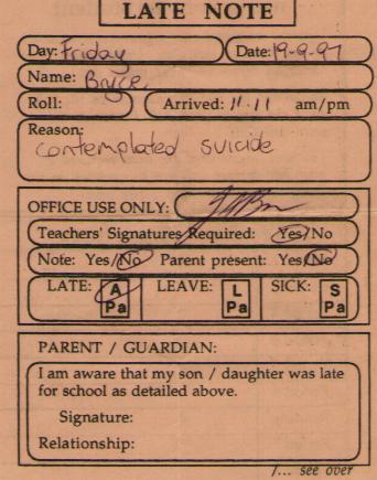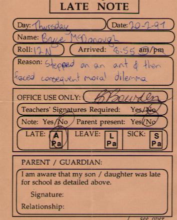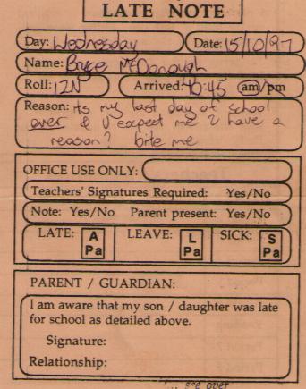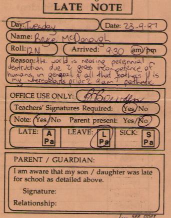 During years 11 and 12, my only creative outlet at high school was thru my occassionally inpunctual attendance, and subsequent justification to the powers that want-to-be. Therefore, after tiring of their continuous questioning of me, I began retaliating with the following collection, all of which (except the last 2, without dates or signatures) were my actual late note from that day. The collection became quite famous, and a cult following grew around them amongst the other students, eventually leading to an entire page dedicated to them in the year book... The part you will be viewing is the entire collection that I still own, however there were definitely a large amount lost over time, as the amount of times I was on time in a month could generally be counted on one hand of a crocodile hunter (seriously, if I was on time once, people were surprised; twice in a row and people were amazed; 3 times just never happened).