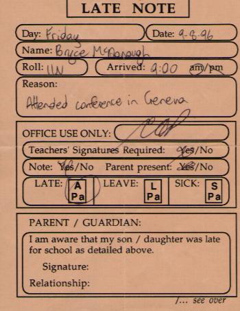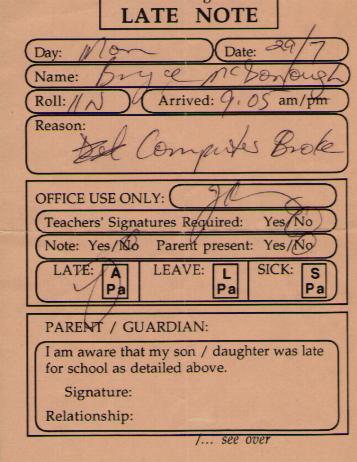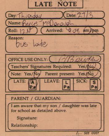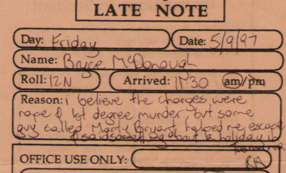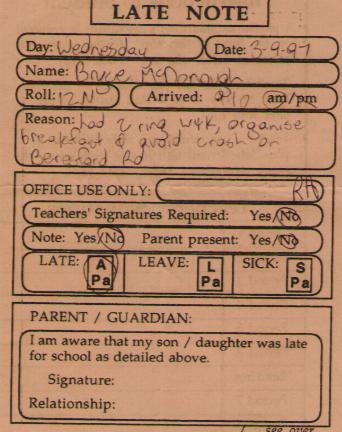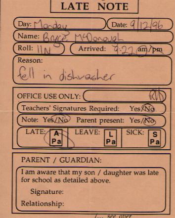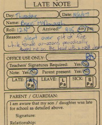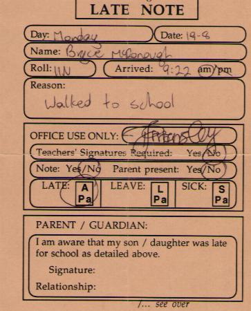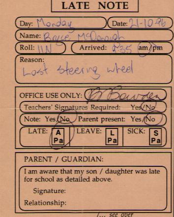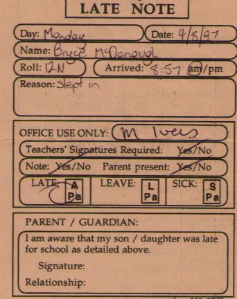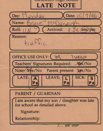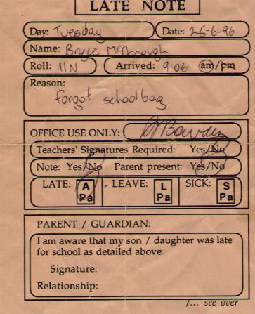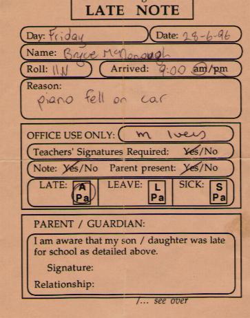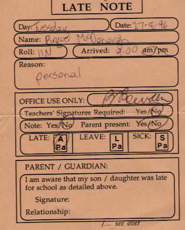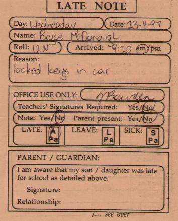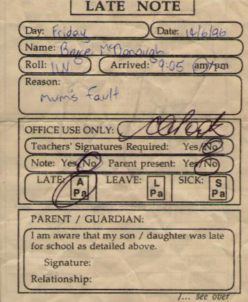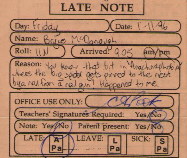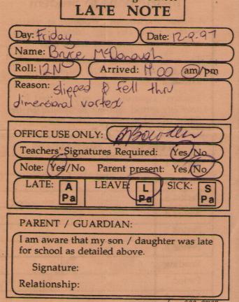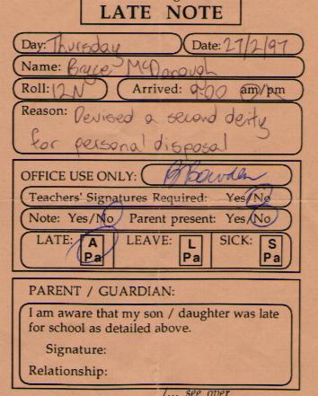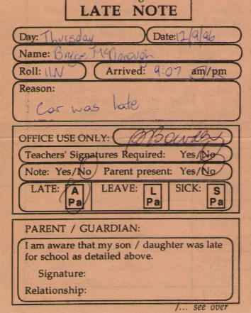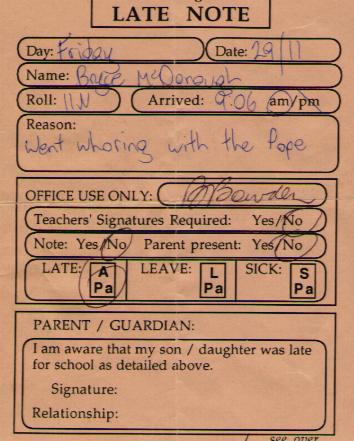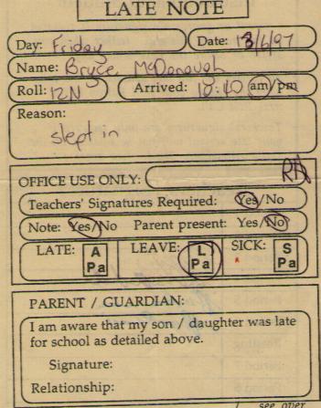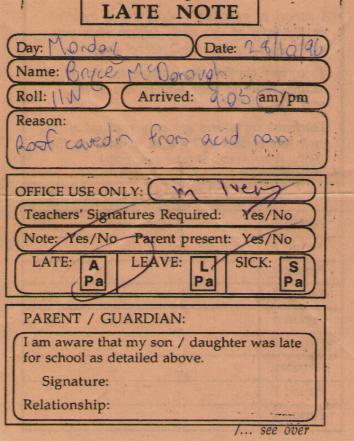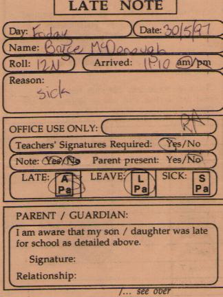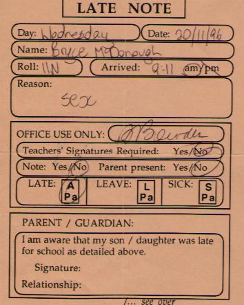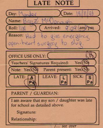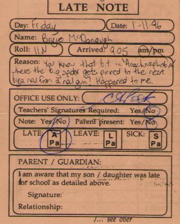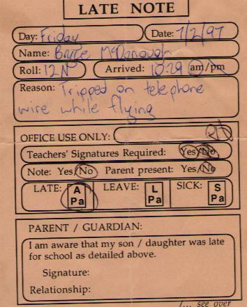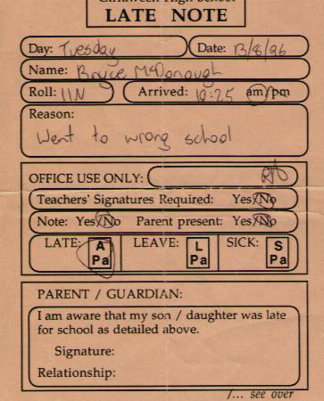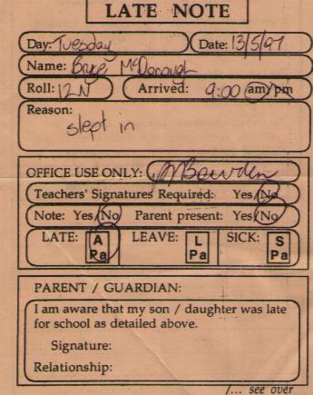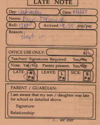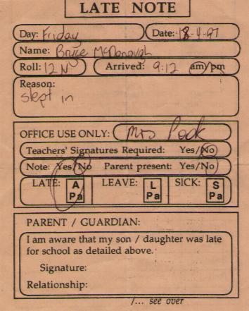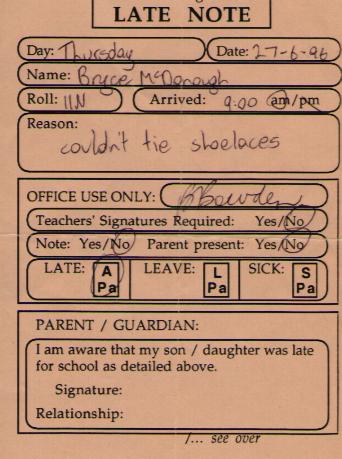 During years 11 and 12, my only creative outlet at high school was thru my occassionally inpunctual attendance, and subsequent justification to the powers that want-to-be. Therefore, after tiring of their continuous questioning of me, I began retaliating with the following collection, all of which (except the last 2, without dates or signatures) were my actual late note from that day. The collection became quite famous, and a cult following grew around them amongst the other students, eventually leading to an entire page dedicated to them in the year book... The part you will be viewing is the entire collection that I still own, however there were definitely a large amount lost over time, as the amount of times I was on time in a month could generally be counted on one hand of a crocodile hunter (seriously, if I was on time once, people were surprised; twice in a row and people were amazed; 3 times just never happened).
